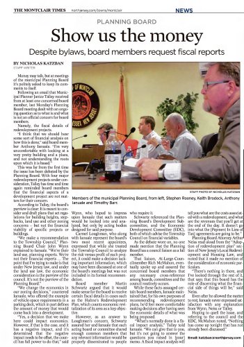 In 2016, Planning Board members requested a financial analysis of the project. The request was dismissed by the Township Planner as “not matters for their concern”. (See Montclair Times, May 26, 2016 page A3)