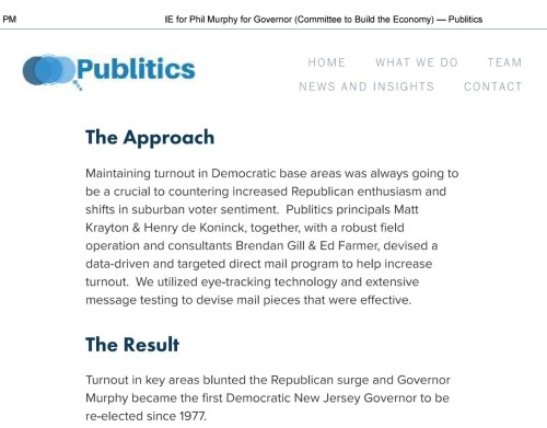 Ed Farmer of Millenium Strategies signed all forms filed by Committee to Build the Economy with the Internal Revenue Service and NJElec. And, according to the Publitics website, the principals, Matt Krayton and Henry de Koninck, along with Brendan Gill and Ed Farmer teamed up “to maintain turnout in Democratic base areas to counter increased Republican support and shifts in suburban voter priorities to ensure the re-election of Phil Murphy in 2021.”