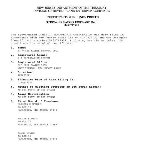 Stronger Fairer Forward, a 501(c)(4) organization was formed by Tammy Murphy in 2022 to “boost the governor’s national recognition” as reported by Northjersey.com in February 2022. The mission promised to focus efforts on “protecting and reinforcing our democracy from the ongoing nationwide assault on election officials and state election laws.”