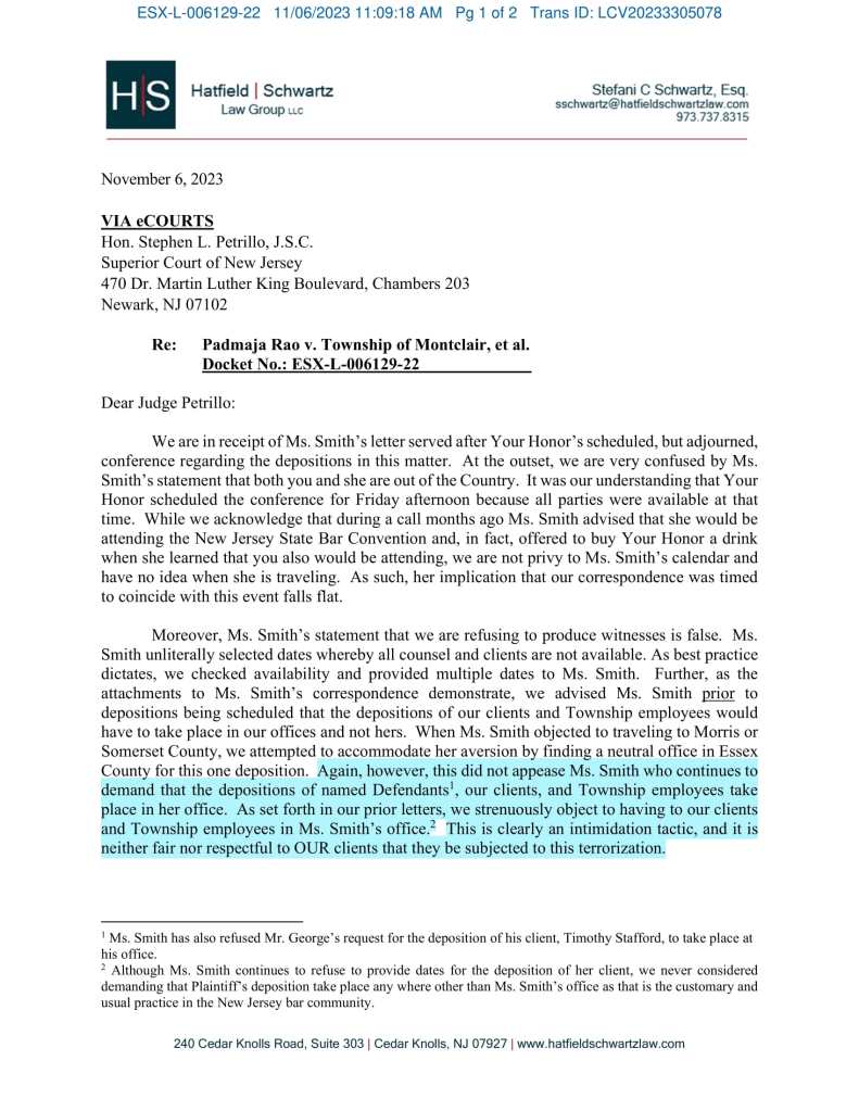 The Township’s defense attorney fees were paid by Garden State Municipal Joint Insurance Fund and totaled nearly $500,000. When the Rao case was hastily settled on the eve of the Montclair 2024 town council election for $1.25 million, the taxpayers were left holding the bag for $1 million, the price of the plaintiff’s attorney fees. The taxpayers received no value in exchange for the $1 million payment – the cost of persecuting the municipality’s Chief Financial Officer, who filed the lawsuit to protect the community from fraud and corruption.